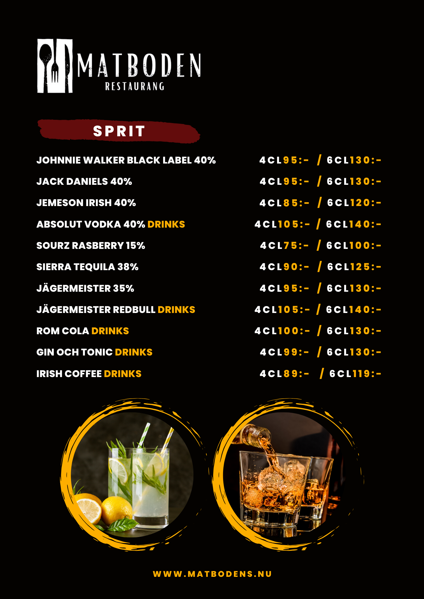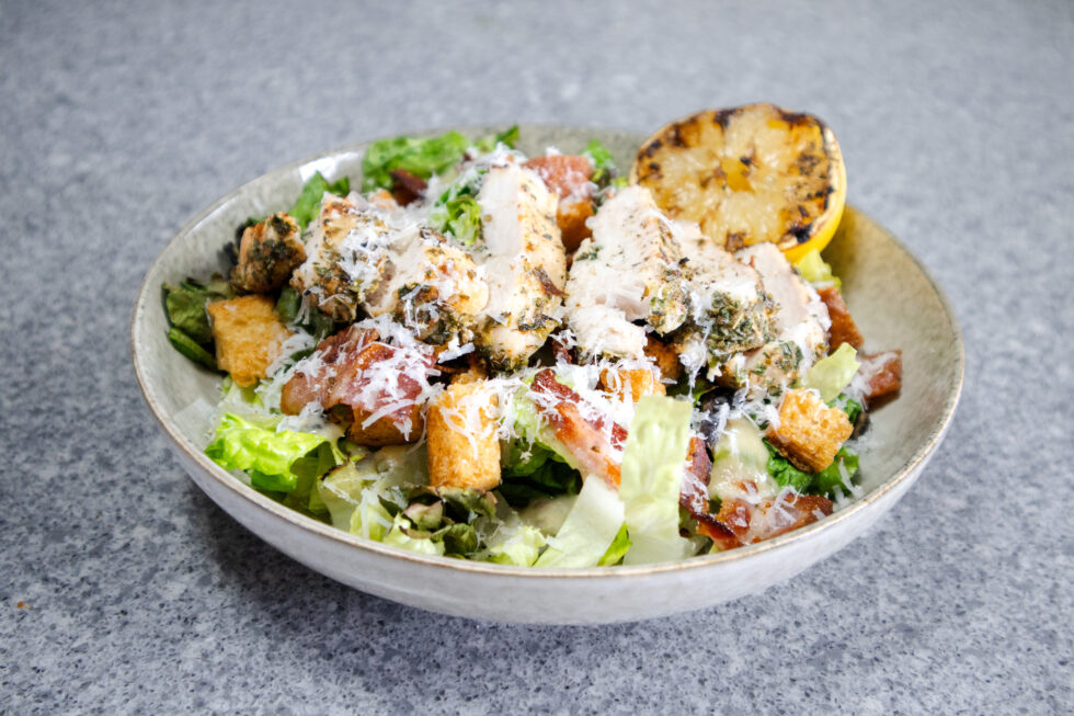 Serveras med isbergssallad, tomat, gurka, kyckling, paprika, rostat vitlöksbröd och Rhode Islanddressing.