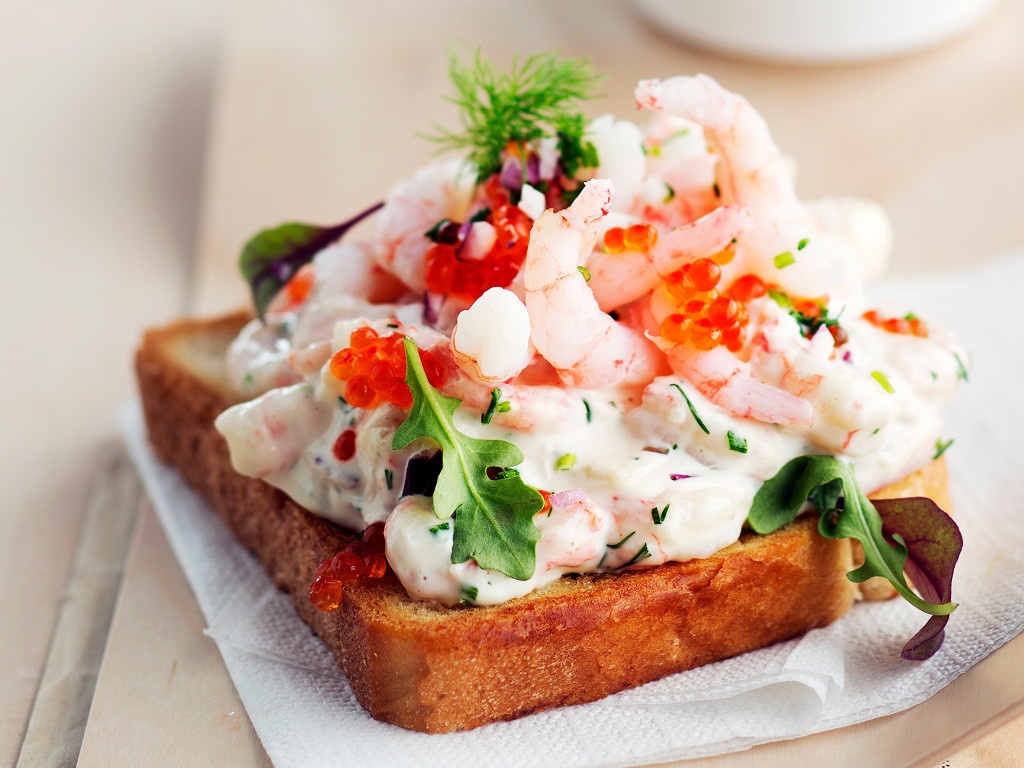 Rostad bröd med sallad, tomat, gurka toppad med skagenröra, hand skalade räkor och röd kaviar