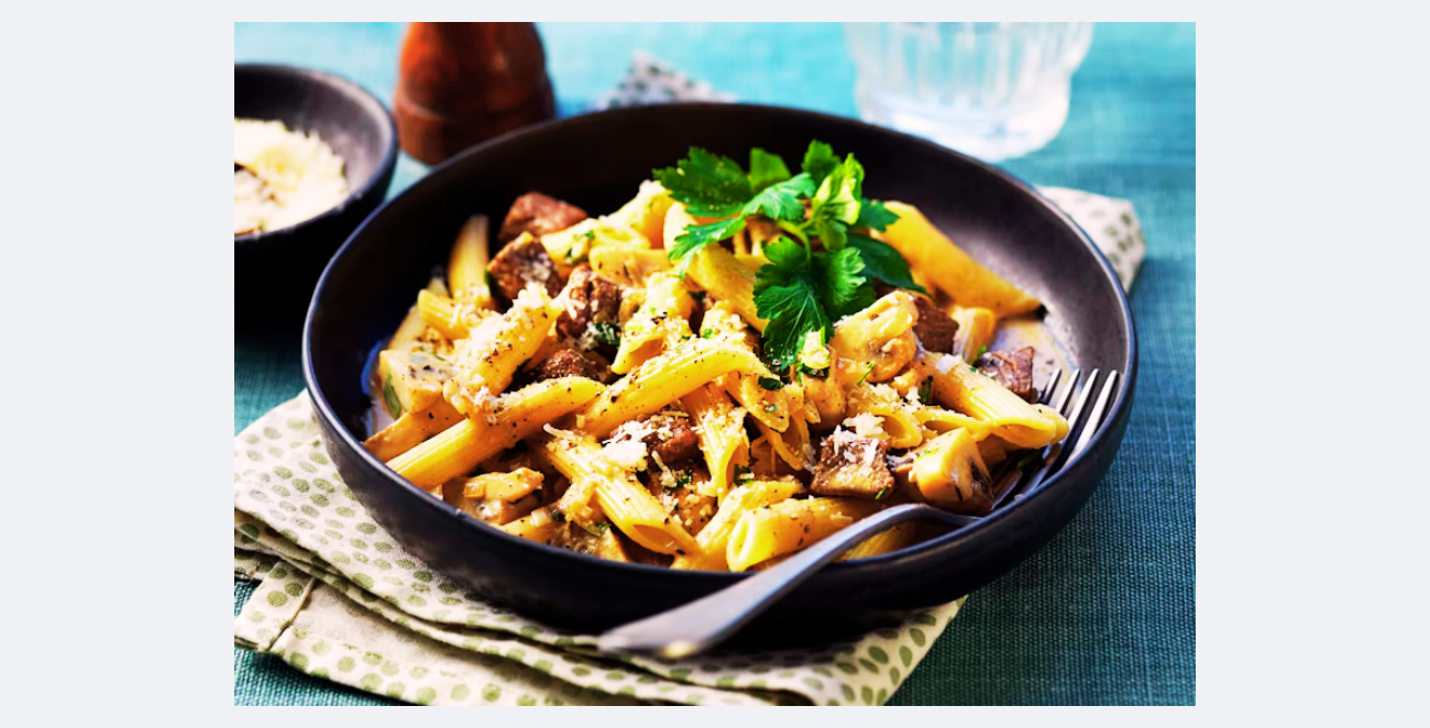 En krämig oxfilépasta med champinjoner, broccoli, vitlök, färsk pasta, grön chili i gräddsås.